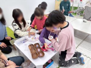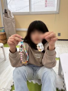 キーホルダーづくりでは、透明なケースにお気に入りのシールやビーズを入れてデコレーションしたり、テグスにビーズを通してブレスレットのような作品を作りました🤩