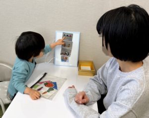 「お母さんが 切る」や「●●くんが 食べる」など、主語と動詞の組み合わせが一致する絵カードを選びます。