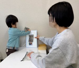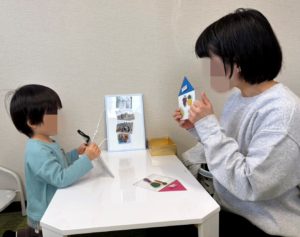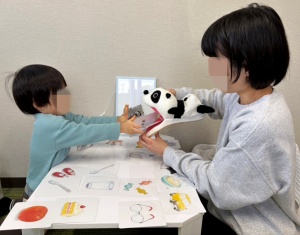 他にも、パンダさんが「●●と●●と●●をちょうだい」とお話してくれたことを聞いて、それに合った絵カードを選んで先生に渡すことでお話を聞く練習をしたり、絵本で数や質問に答える練習をしたりと、それぞれの利用者さんの状況に合わせて、楽しみながらできる訓練を日々行っております💪