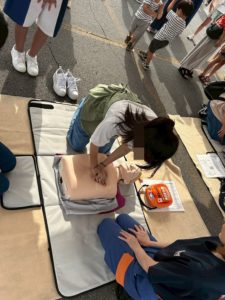 お次はAED体験!生徒さんはみんな初めての経験ですが物は試し!やってみましょう!