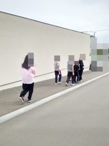 そらいろの生徒さんが多く通われている学校という事もあり、近所に住んでいる生徒さんは大地震が起きたら家族と一緒にこのルートで逃げると話している子もいました。ただ歩くだけではなく事業所から避難場所までどんな危険があるかを考えながらみんなで確認していきます。