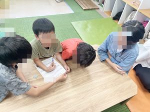 落下物の危険を考えた生徒さんが非常に多かったので、次回はそらいろ内での危険な場所やどのようなもので身を守れるか、またどんな姿勢で揺れがおさまるまで待ったら良いかも併せて再度検討していきたいと思います。