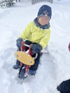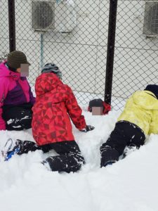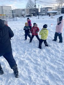 雪中鬼ごっこでは、雪の上を本気で走る難しさを学び、全員が交代で鬼になるようお友達同士で声を掛け合い、