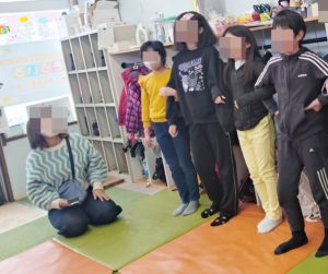 この遊びを知らない生徒さんもいて、手を繋ぐのも初めは恥ずかしそうにしていましたが、遊んでるうちに笑顔で最後まで楽しめました(^-^)